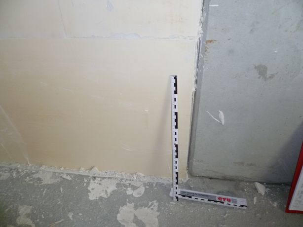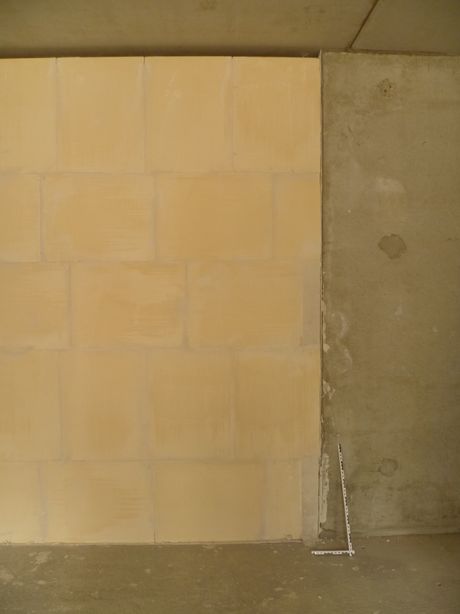 Um eine Schallbrücke zu vermeiden, sind bei Baustoffwechseln – bei uns also zwischen Gipswand und Stahlbeton (siehe Foto oben) – Randstreifen aus Gummi angebracht. Diese dürfen nicht kürzer sein als die Wanddicke (müssen also bündig abschließen oder überstehen). Das war bei zwei Exemplaren nicht der Fall: