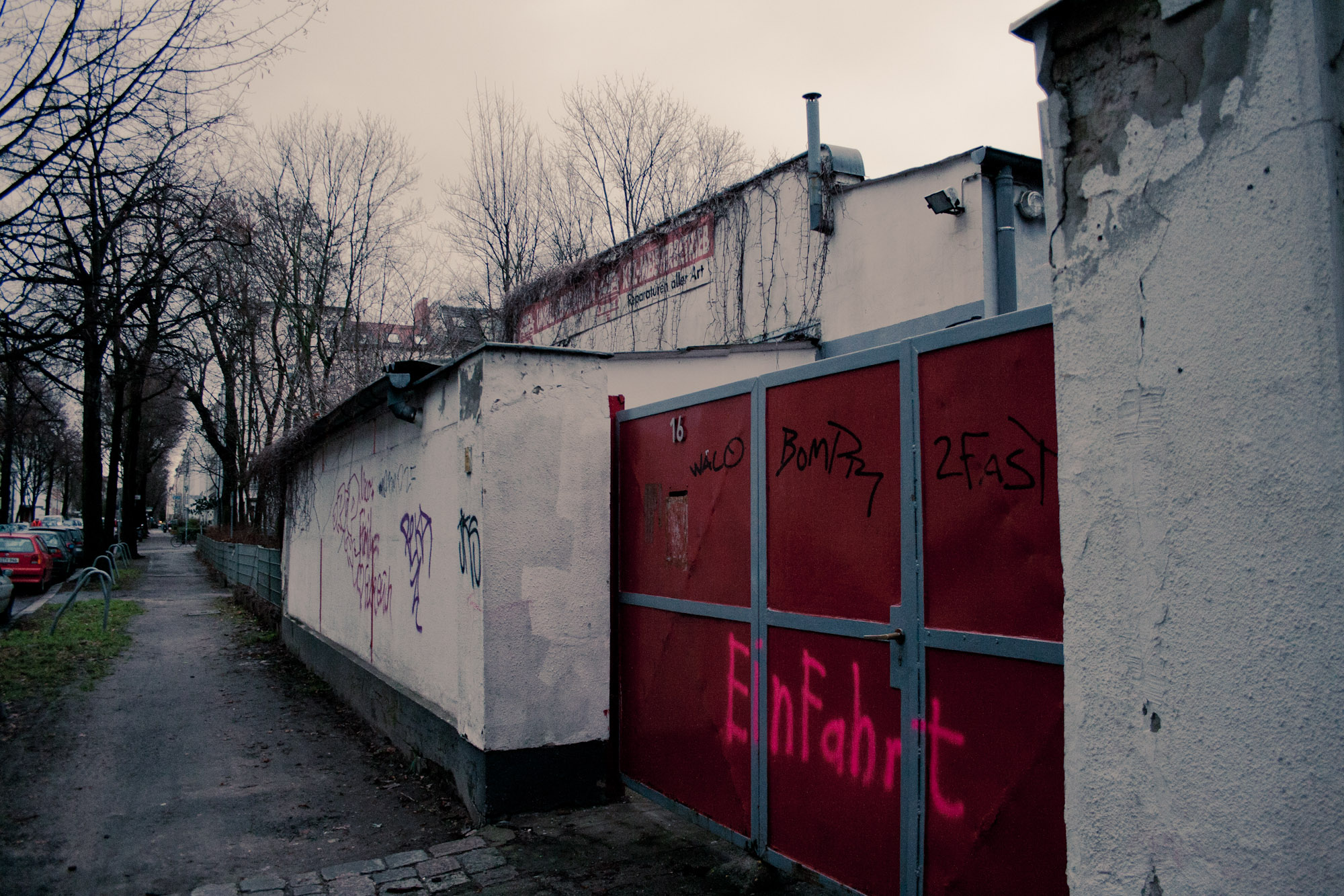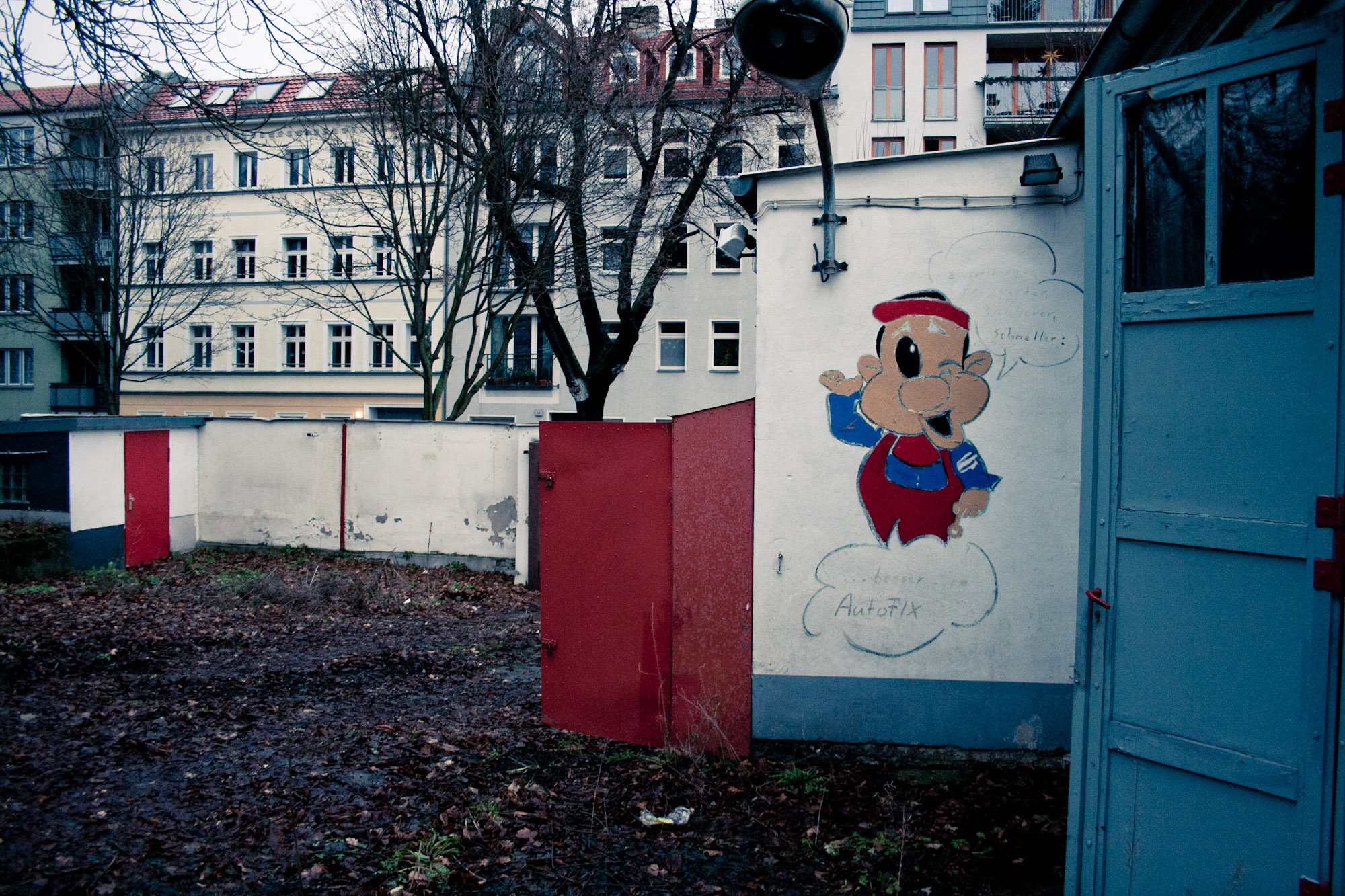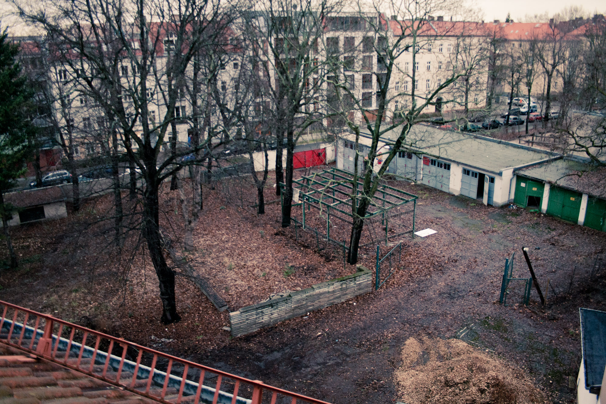 Die an den Spielplatz angrenzenden Gebäude gehören zu einer ehemaligen Autowerkstatt, die es seit dem Verkauf des Grundstücks durch die katholische Kirche dort nicht mehr gibt. Es handelt sich um Flachbauten, in denen im Prinzip nichts mehr ist (hoffentlich auch keine Altlasten im Boden — laut Verkäufer liegt aber ein positives Bodengutachten vor und die Erde werde eh für die Tiefgarage bis zu einer Tiefe von 8m ausgehoben).