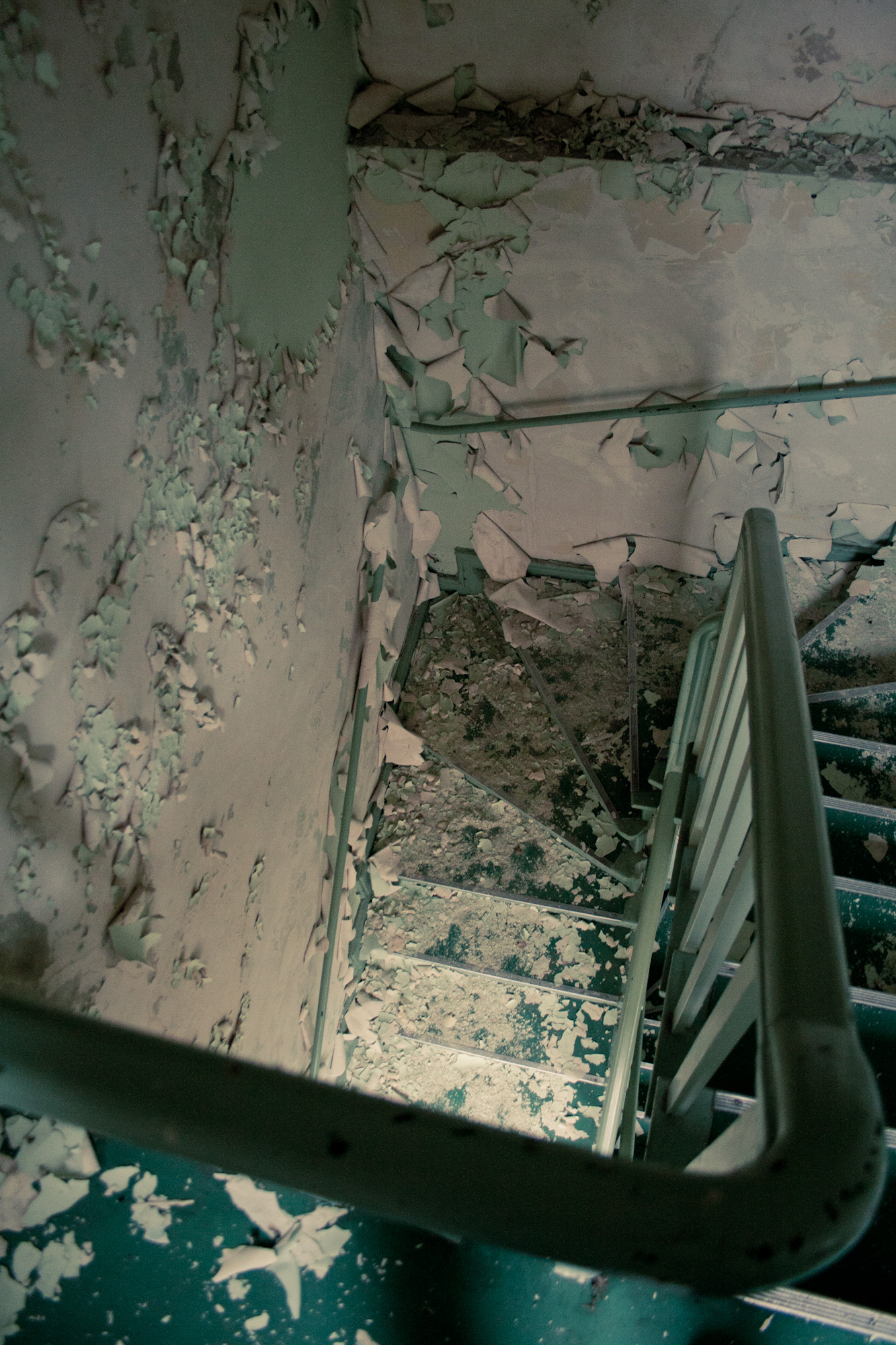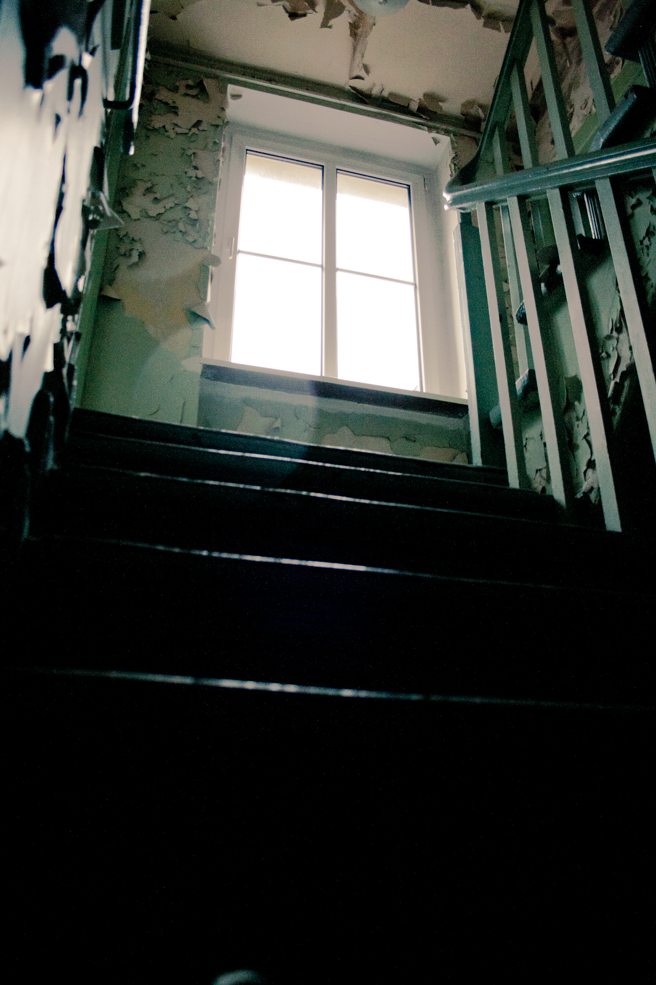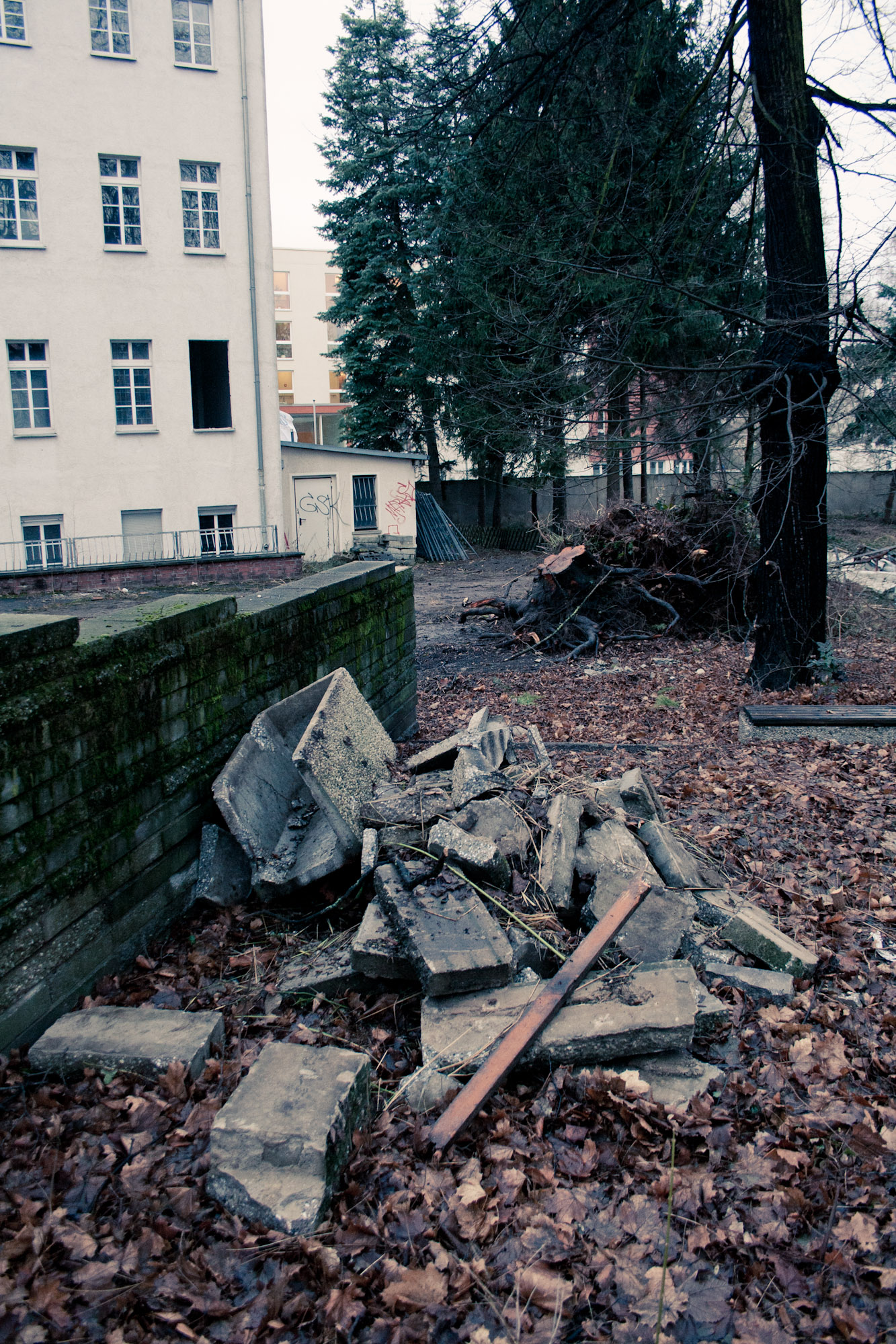 Das Gebäude Gürtelstraße 8 ist der ehemalige Sitz der Caritas Brandenburg. Der Hochbau beherbergte neben diversen Büros auch eine Kapelle, in der sich noch Mosaik-Glasfenster befinden. Das Gebäude ist leer und verfallen, alle Leitungen wurden aus den Wänden gerissen — da waren bestimmt Kupferdiebe am Werk.